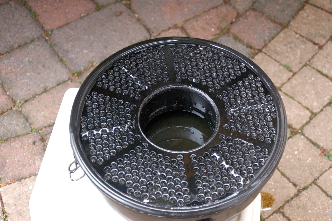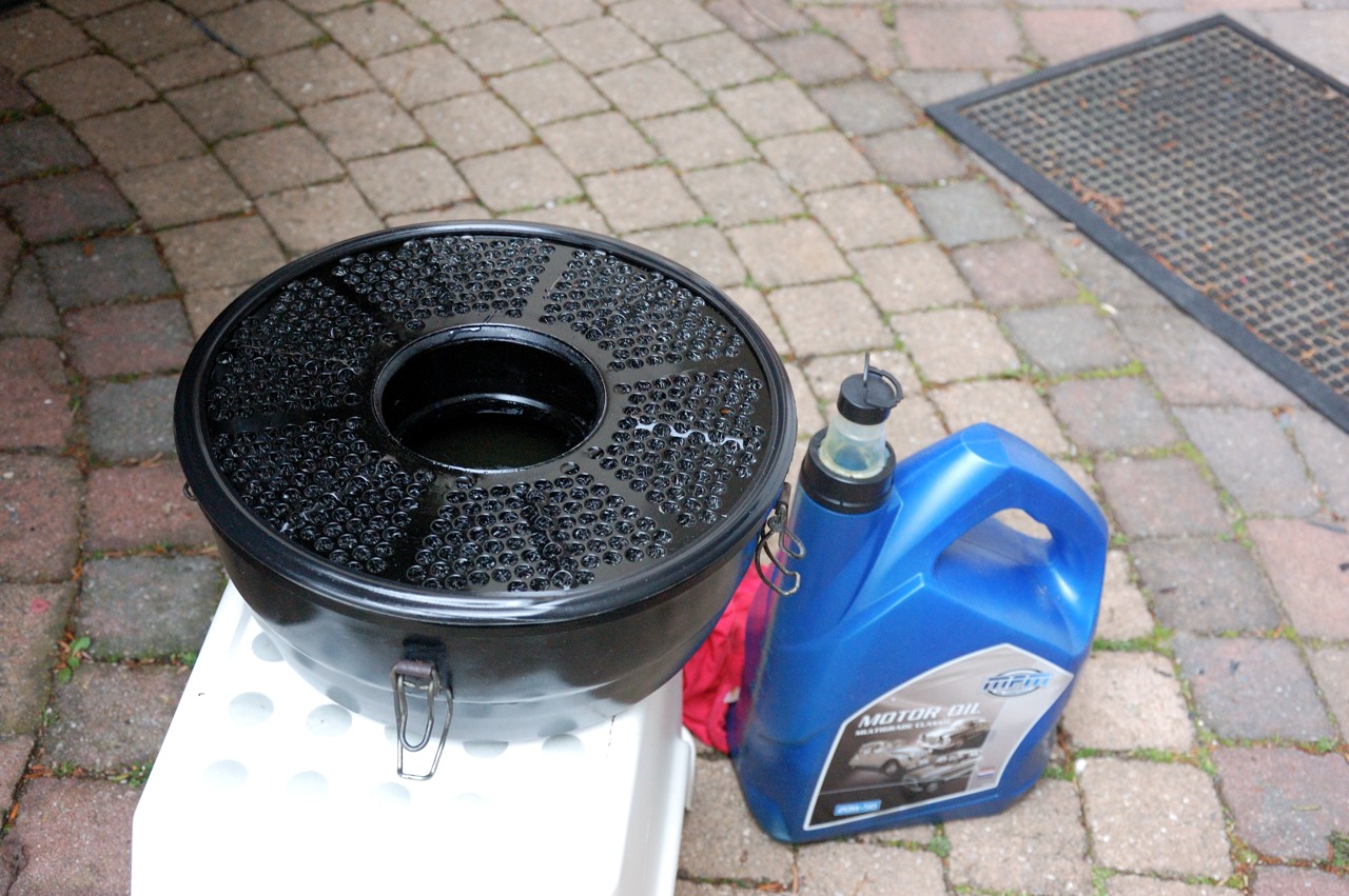 Dit is het idee, de lucht stroomt van boven door het midden vlak langs de oliefilm door het stalen filter weer omhoog