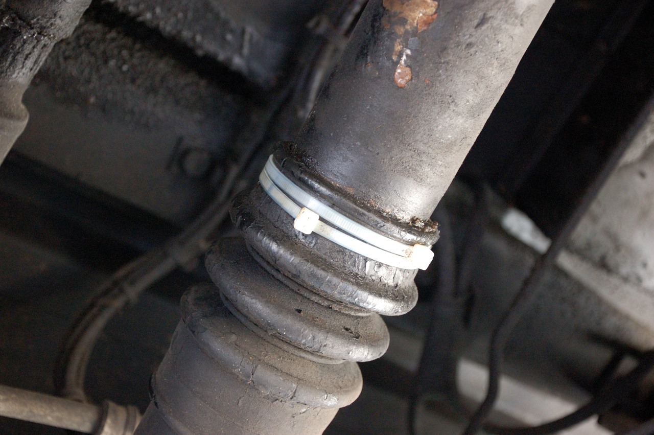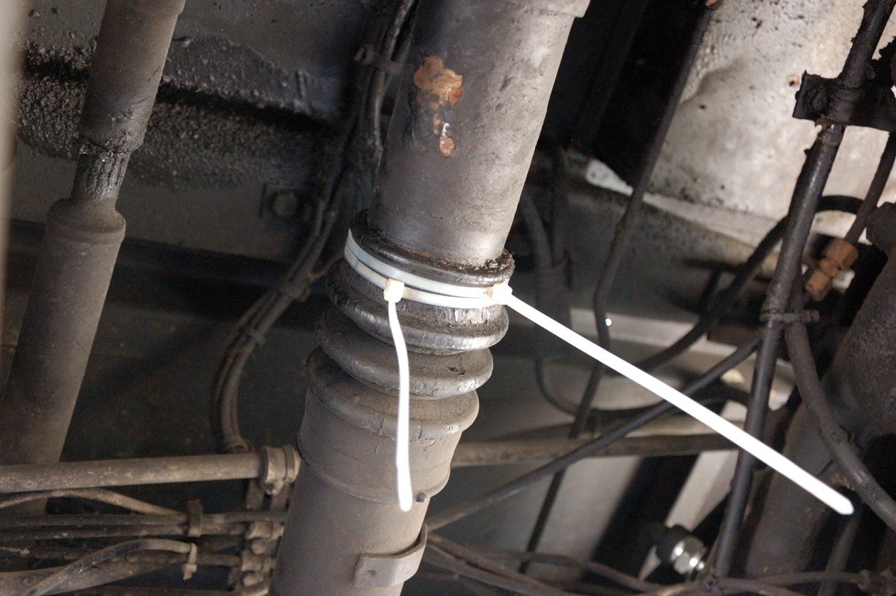 Bij het doorsmeren kwam aan het licht dat een klem van een manchet ontbrak van een aandrijfas. Hier is provisorisch maar een tijdelijke oplossing gevonden in de vorm van 2 tierips maar dit moet snel worden verholpen.