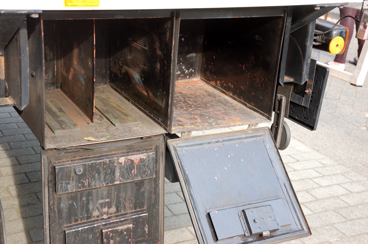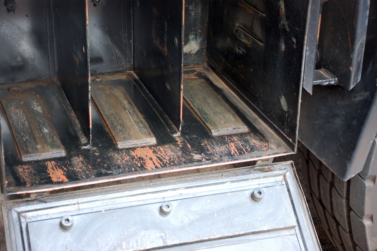 Het doel van de bakken verschilt. Er zijn 2 ingericht om jerrycans te vervoeren, dat kunnen in totaal 5 jerrycans van 20 liter zijn en de andere 2 zijn voor opslag en gereedschap. De bakken zijn ook daadwerkelijk gebruikt om diesel in te vervoeren getuige de vies vettige aanslag, tijd om dat eens netjes schoon te maken dus.
