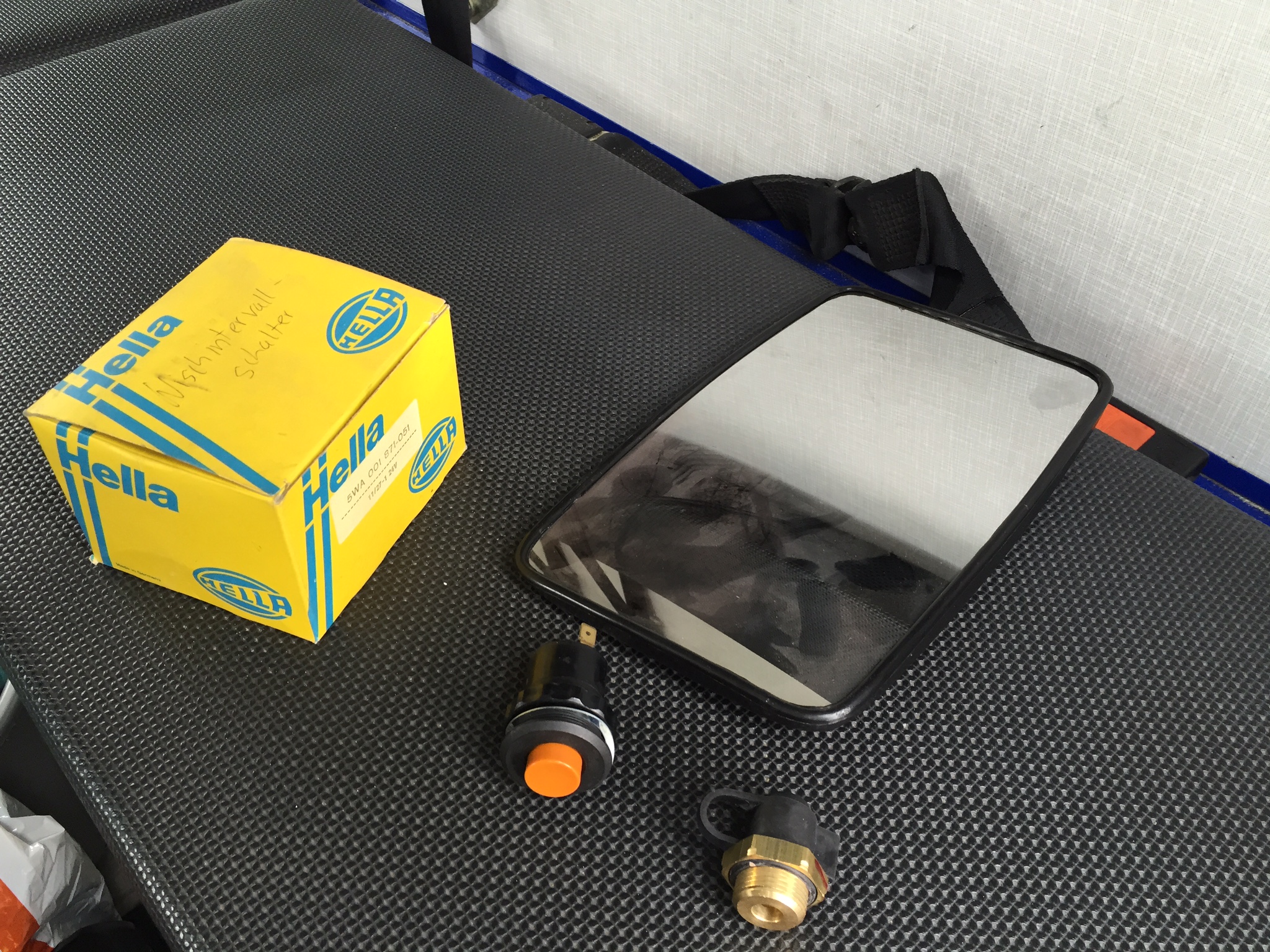 Dit was uiteindelijk de buit, een nieuwe spiegel, een drukschakelaar, een testventiel voor het luchtsysteem en een intervalschakelaar voor de ruitenwisser. Die laatste bleek weer eens onmisbaar op de heenweg, 100 kilometer met net niet regen, dan blijf je op de aan- en uit knop drukken. Snel inbouwen dat ding !