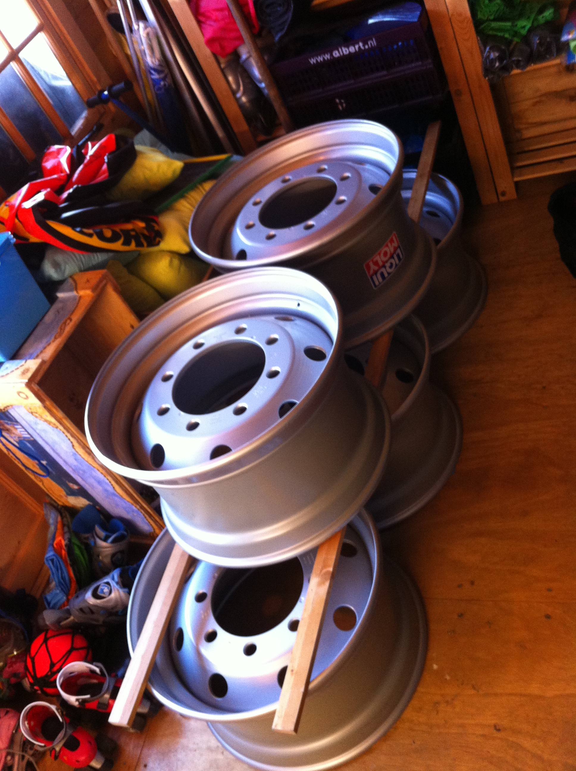 De velgen zijn inmiddels binnen en hoewel het een beetje proppen was in de auto is het prima gelukt. Overigens wegen ze 45 kilo per stuk dus ik heb mijn training wel weer gehad 😉