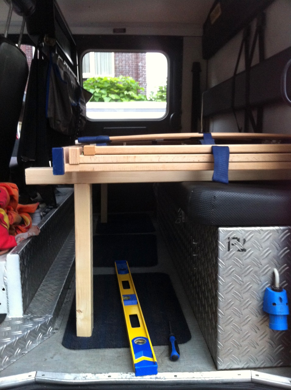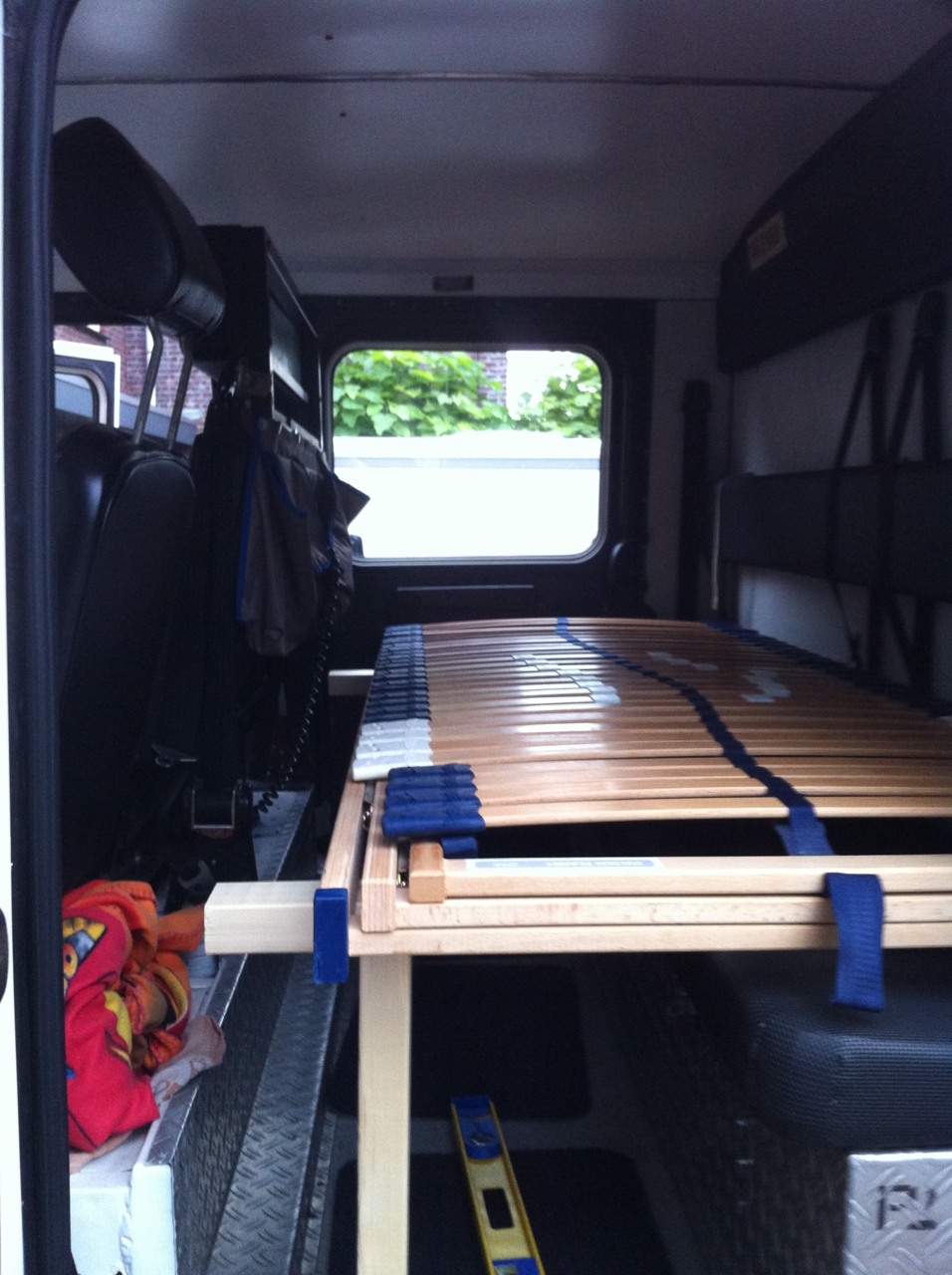 Vrijdagmiddag werd een pak hout opgehaald en een 2e hands Ikea lattenbodem via Martkplaats gescoord. Een en ander was even passen en meten maar al snel stond het bed stevig in elkaar. Een matras erop met een dekbed en klaar was de slaapplek. Onder de voorbank paste precies een balk zodat de zitting van de bank recht kwam te staan. Een klein matrasje hierop en ook die slaapplek was snel ingericht.